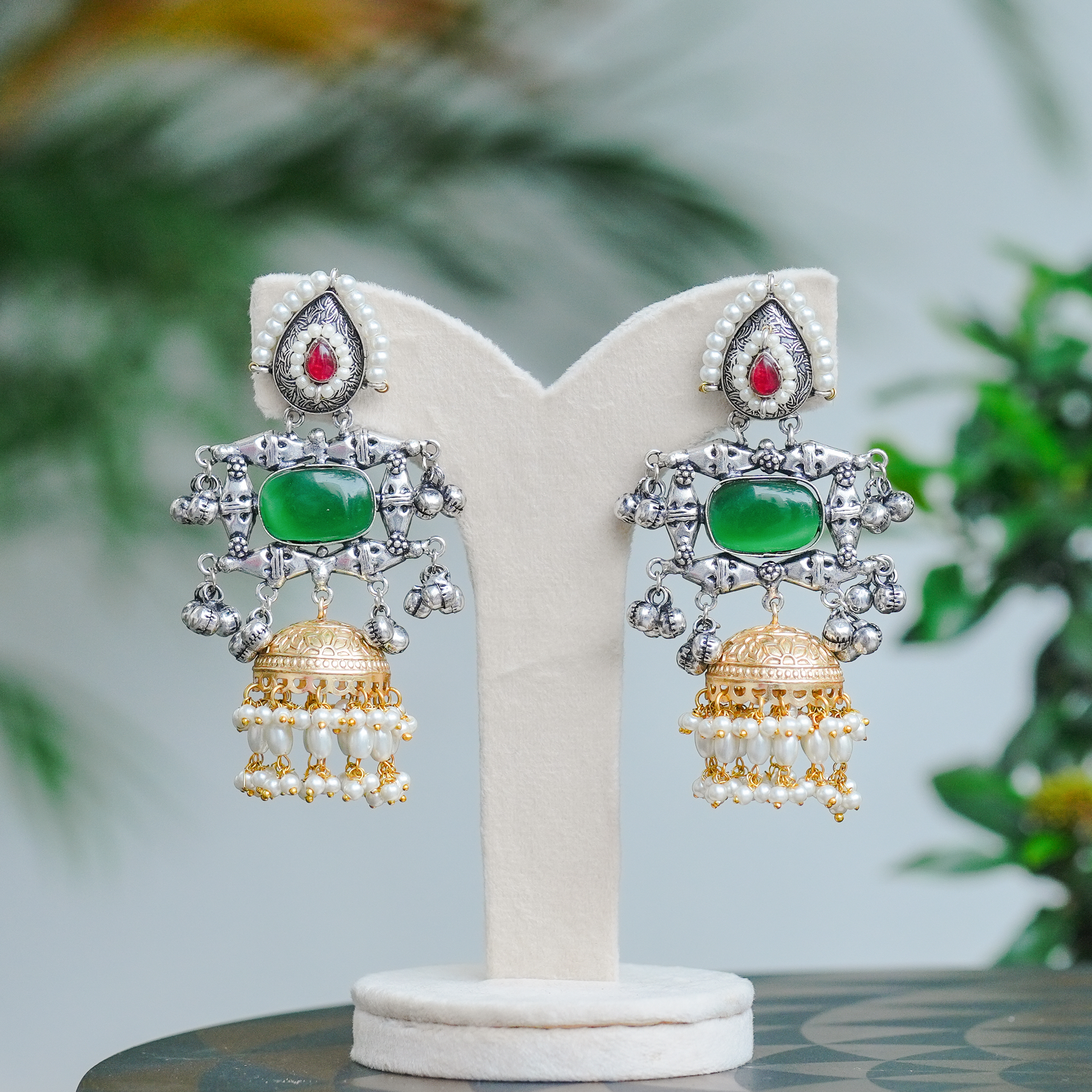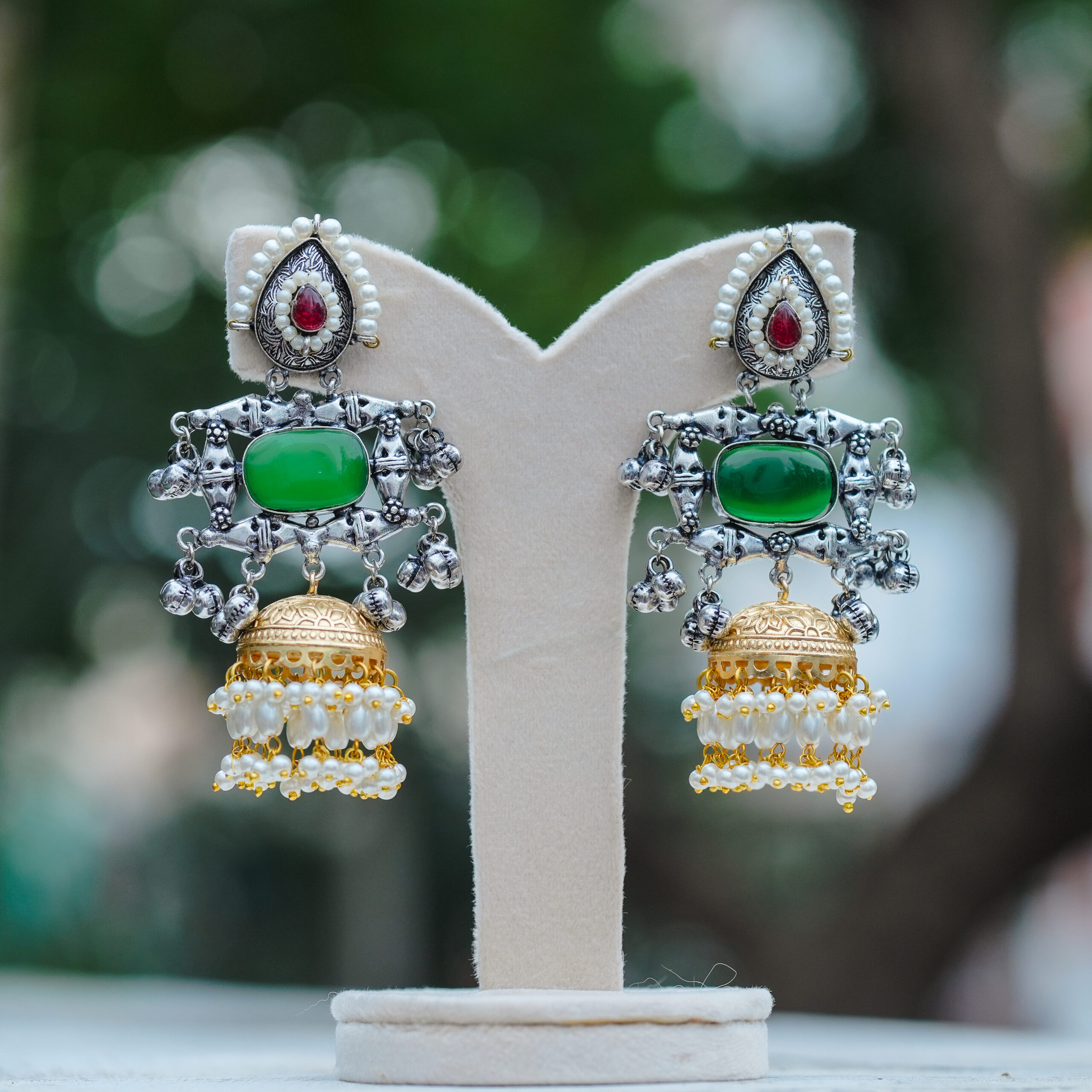 A stunning fusion of traditional and contemporary style. These earrings feature beautiful green stones set in oxidized silver, creating a bold contrast that enhances the vibrant color. The large Jhumukkas are detailed with intricate designs and finished in gold tone, adding a touch of opulence. The combination of the green stones and gold-tone jhumkas gives the earrings a regal yet modern appeal, making them perfect for weddings, cultural events, or festive occasions. These earrings make a statement, adding elegance and charm to any ensemble.